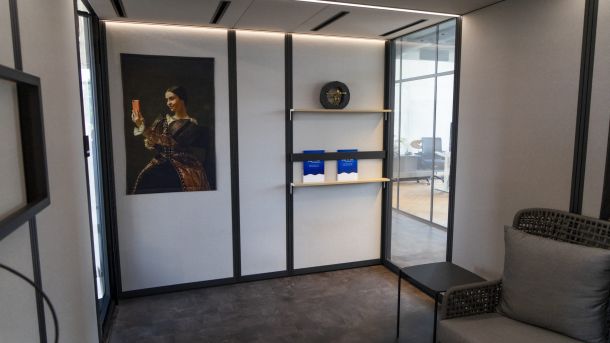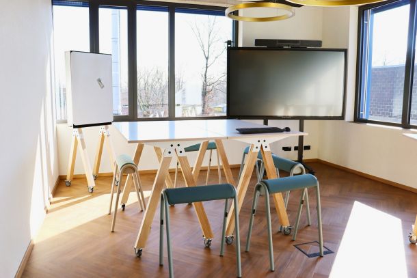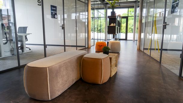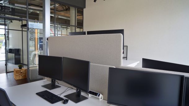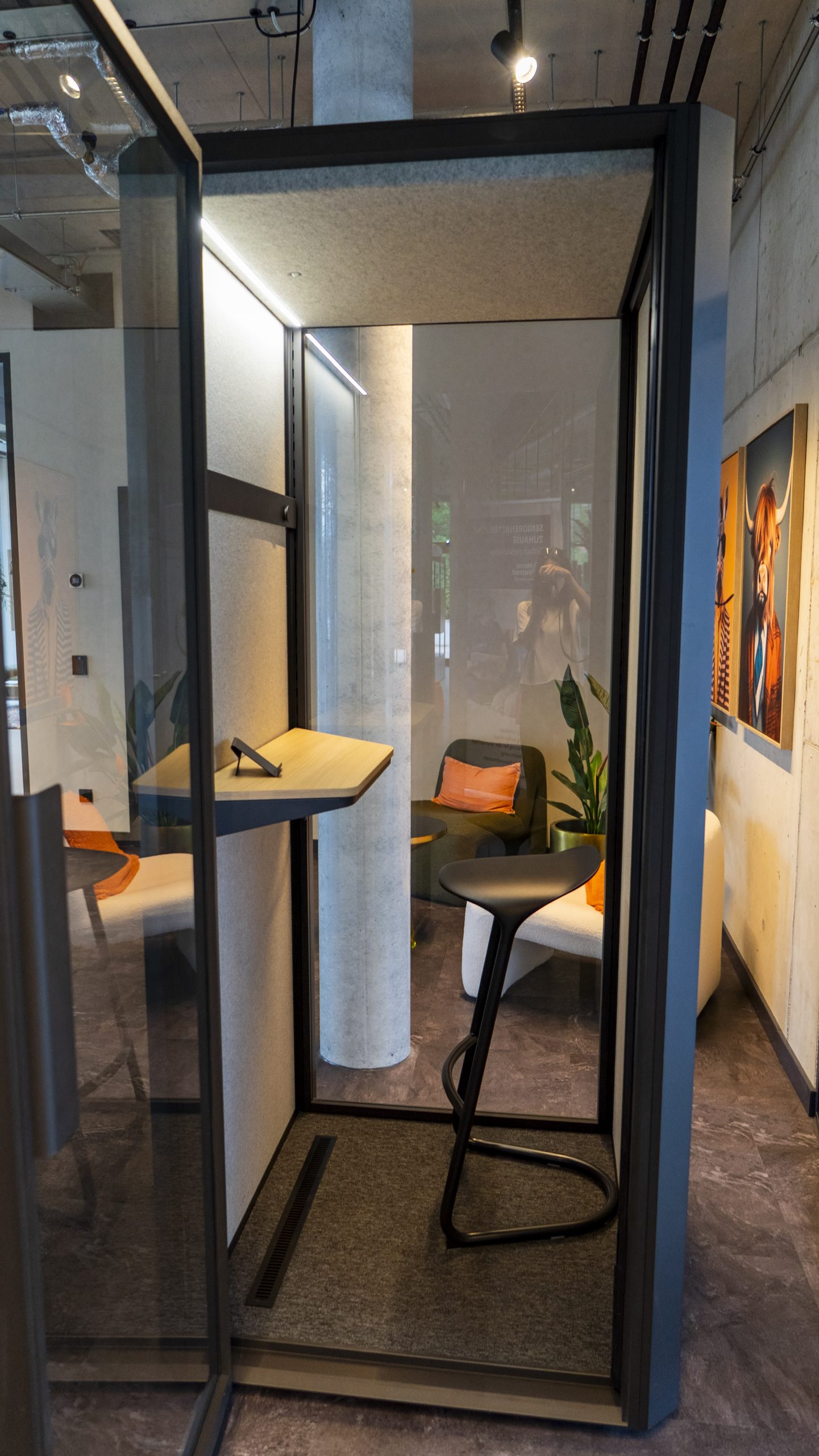 Akustikscreens an allen Schreibtischen, Filzpaneele in halboffenen Büros und weitere Akustikelemente sorgen für eine spürbar verbessere Raumakustik. Besonders hervorzuheben sind hierbei die verwendeten Akustikwände, die gleichzeitig als Pinnwand, Whiteboard und Ablage dienen und bei Bedarf erweiterbar sind. Silent Boxen in verschiedenen Größen bieten Rückzugsmöglichkeiten in stark frequentierten Bereichen. So entstand Raum für konzentriertes Arbeiten, ruhige Telefonate und vertrauliche Gespräche. Der innovative Besprechungsraum im Bereich der Unternehmenszentrale mit seinen agilen, modularen Möbeln sind ein mutiger Ansatz für moderne Besprechungen.