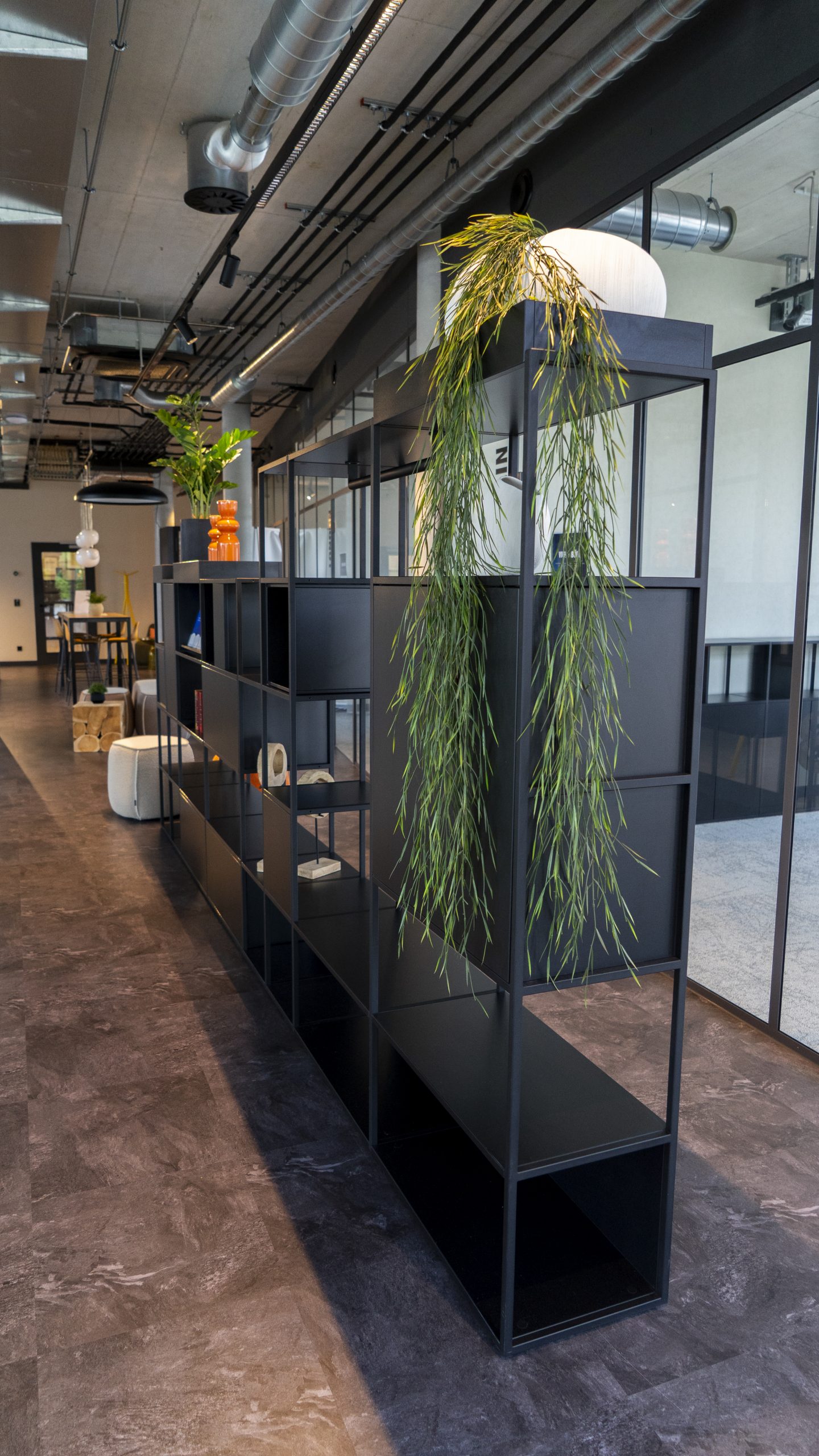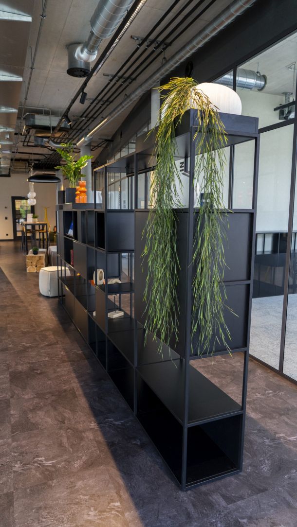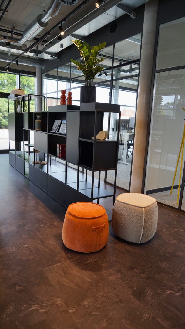 In der Mittelzone des CoWorking Bereichs wurde ein raumgreifendes Regalsystem mit integrierter Garderobe individuell geplant. Es ist nicht nur ein echter Hingucker, sondern sorgt auch für Ordnung. Die weiteren gewählten Möbel in den offenen, hellen Büros des Shared Spaces schließen sich optisch an das klare Design der Mittelzone an. So entstand ein stimmiges, klar strukturiertes Gesamtbild. Auch in der Verwaltung integrieren sich individuell gewählte Schränke und Stauraumlösungen nahtlos in das Gesamtbild der verschiedenen Arbeitsbereiche ein. Im Empfangs- und Pausenbereich lag der Fokus hingegen auf einer hohen Aufenthaltsqualität und informeller Kommunikation. Dies wurde durch gezielte Möblierung wie zum Beispiel der eingesetzte Hoch-Tief Tisch mit entsprechender Bestuhlung, realisiert.
